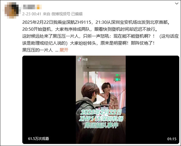 23日,有网友发文称,22日,自己在深圳宝安机场乘坐深航ZH9115,遭遇“男团插队”。