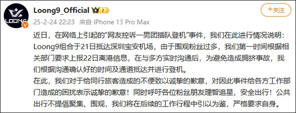 @Loong9_Official 表示,对于给同行旅客造成的不便致以诚挚的歉意,对因此事件给各方工作部门造成的困扰表示诚挚的歉意!同时呼吁各位粉丝朋友理智追星,安全出行!公共出行不提倡聚集、围观,我们将在后续的工作行程中引以为鉴,严格要求自身。
